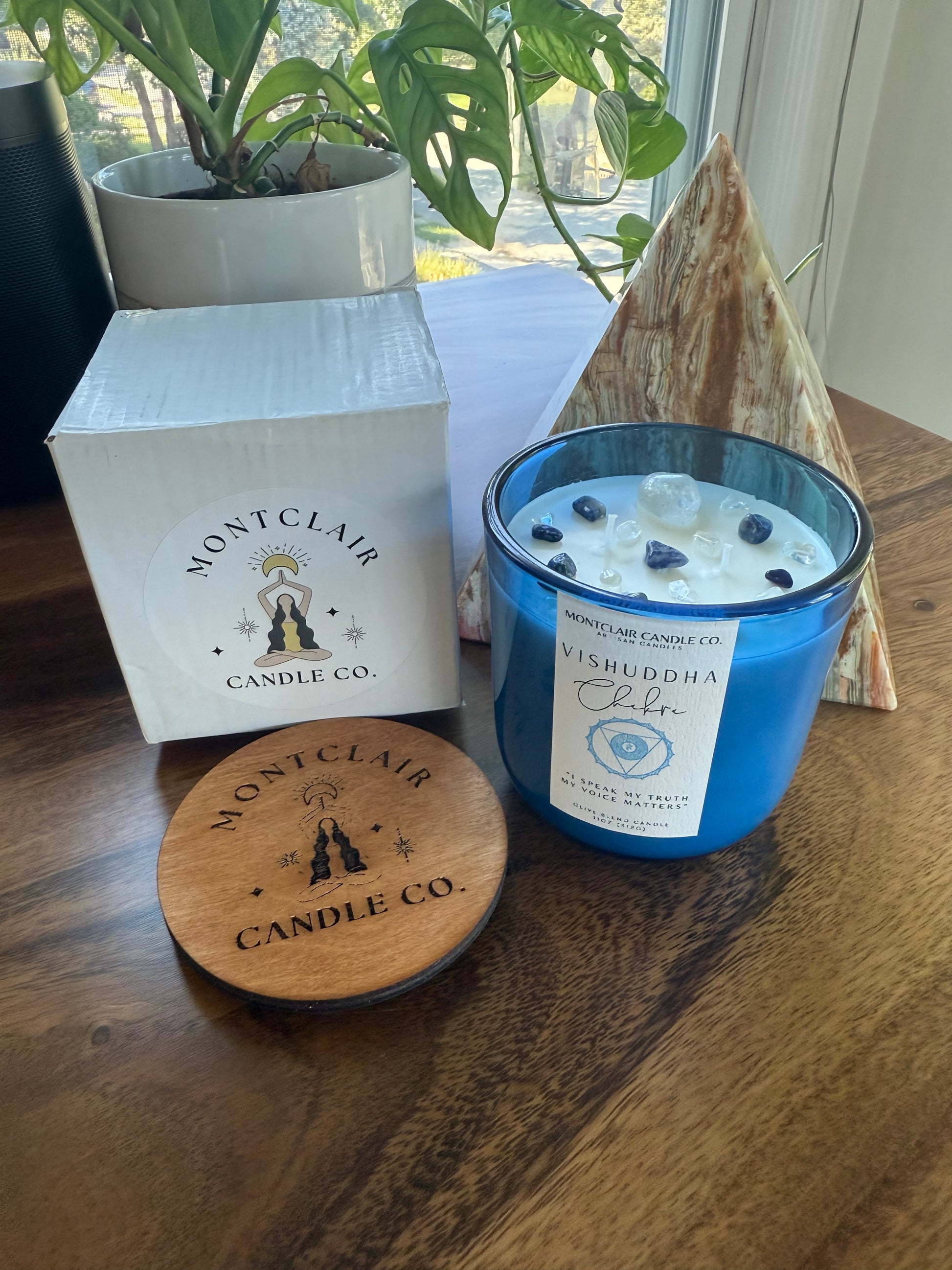Infused with clear quartz for amplification and sodalite for authentic communication. Each candle is reiki-infused, sound bath blessed, and cleansed with sage and palo santo to open your center of truth and self-expression.