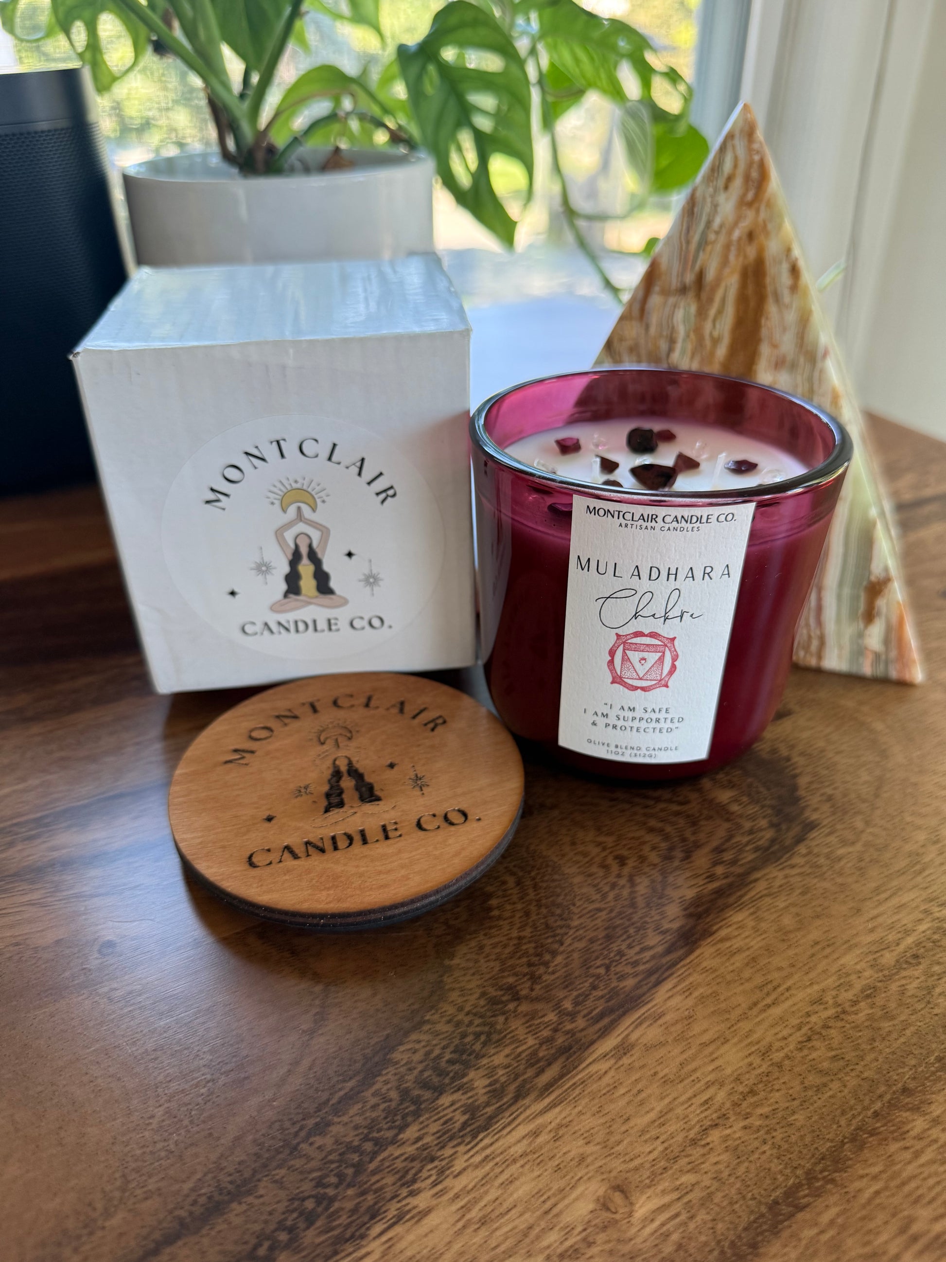 Set with garnet crystals for strength, mahogany obsidian for protection, red jasper for stability, and clear quartz for amplification. Each candle is reiki-infused, sound bath blessed, and cleansed with sage and palo santo to activate your foundation of security and grounding.