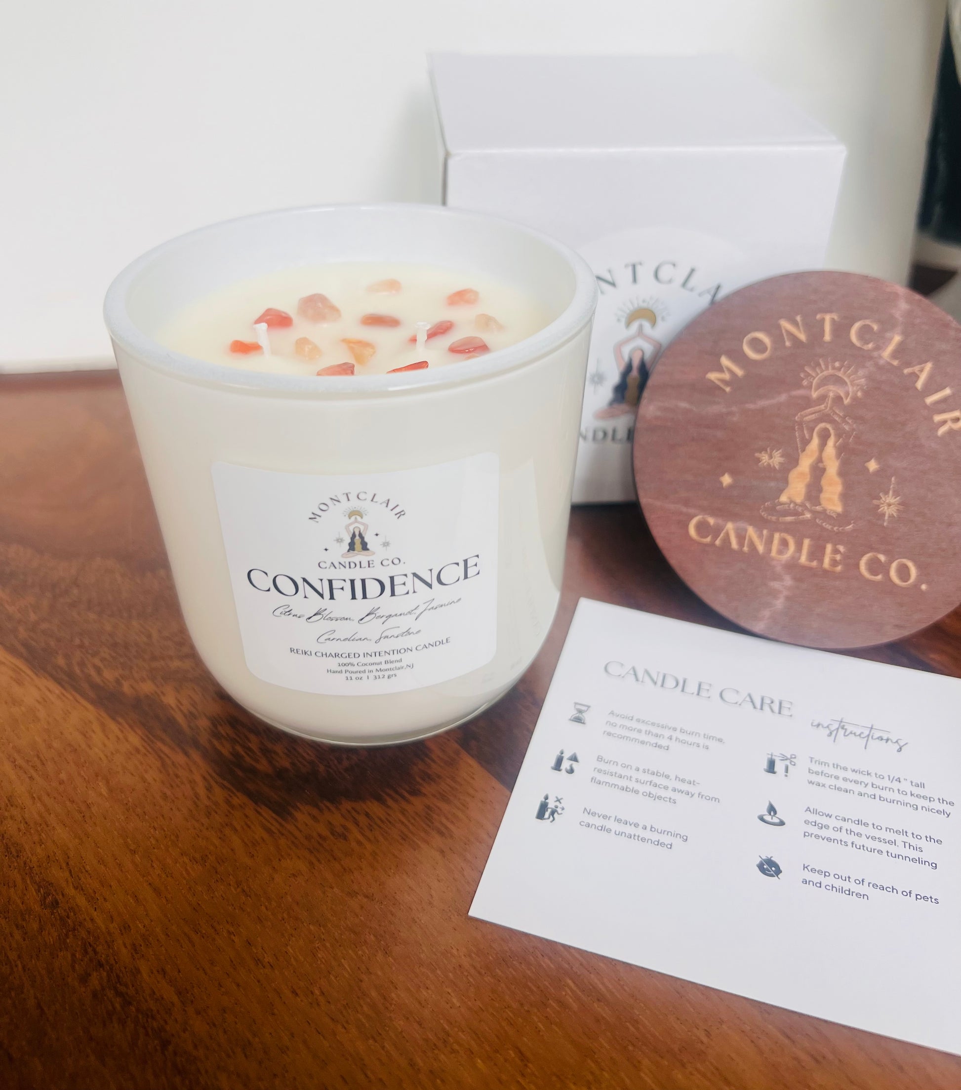 *Each candle is packaged in an individual box with a wooden lid engraved with our logo and a candle care card, unless otherwise stated.