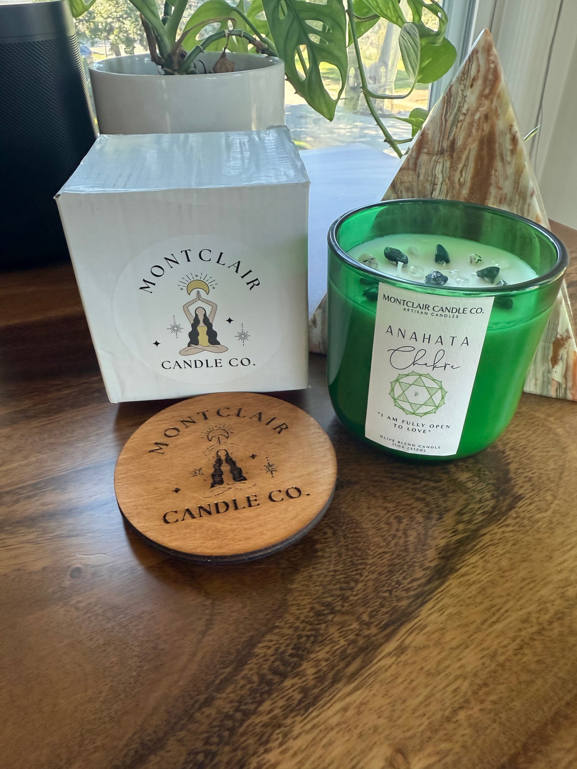 Crystals placed are green jasper for emotional healing, moss agate for heart-centered growth, and clear quartz for amplification. Each candle is reiki-infused, sound-blessed, and cleansed with sage and palo santo to activate your center of love and compassion.